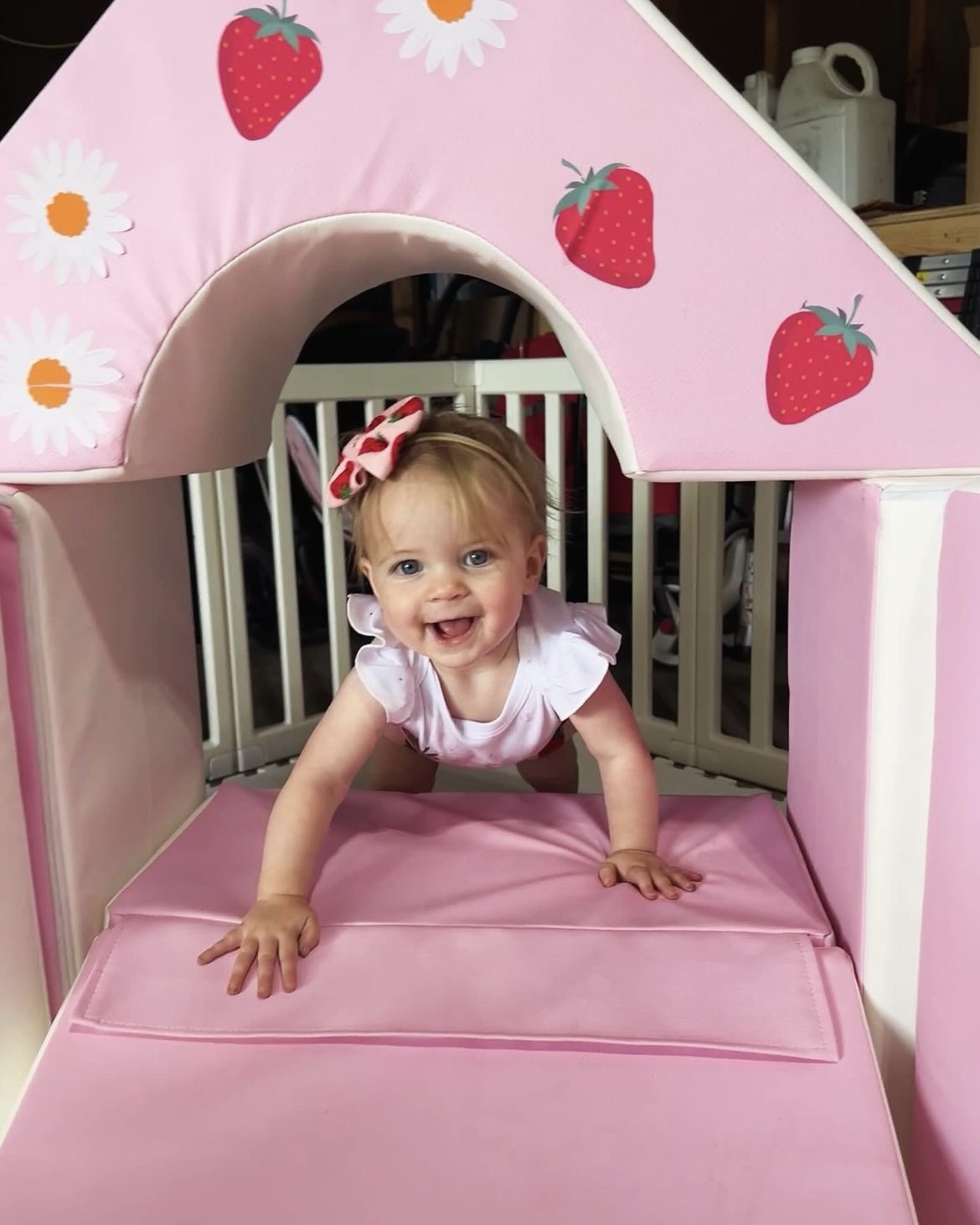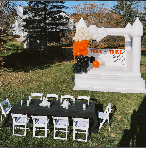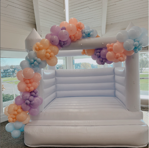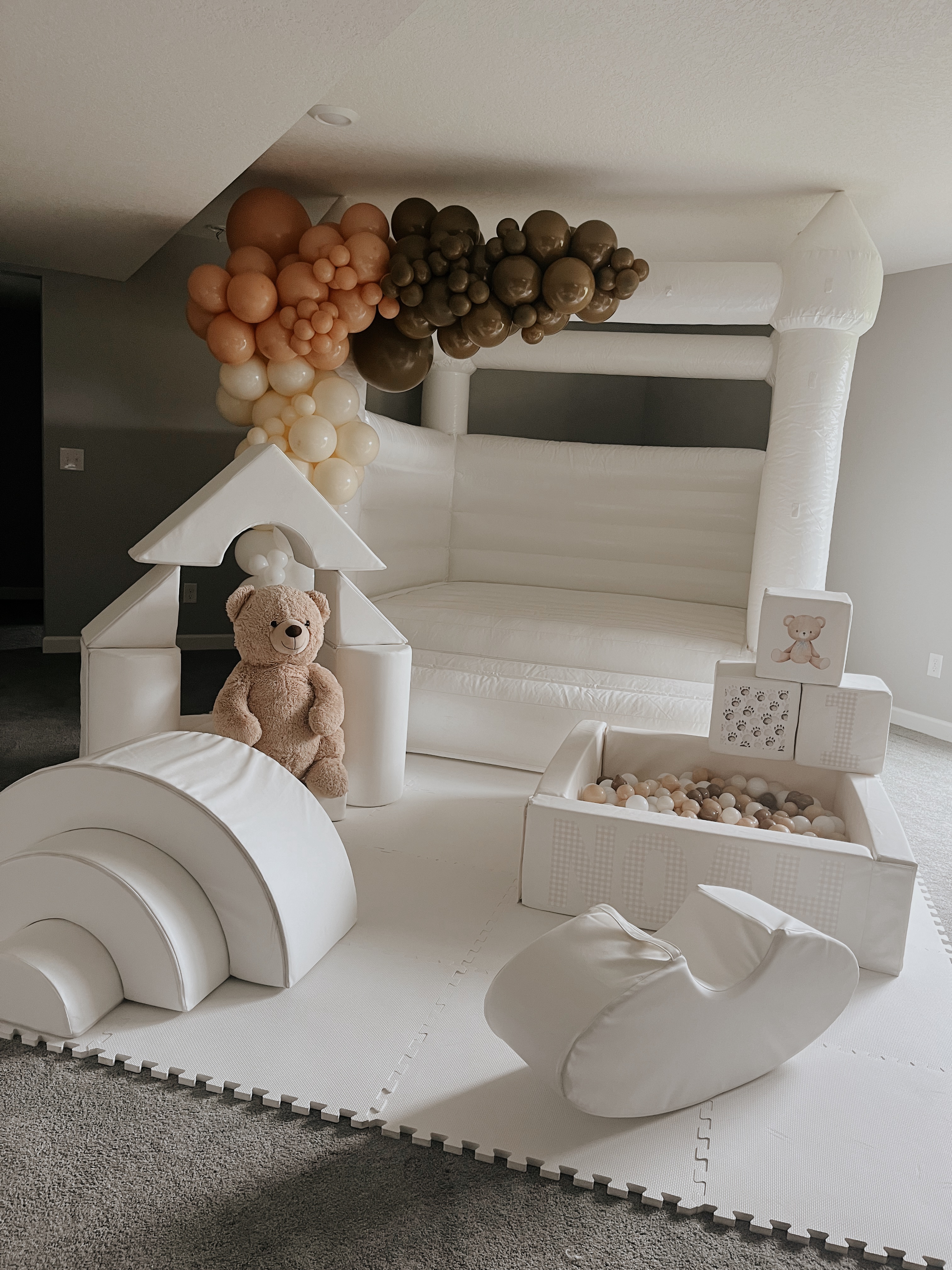 IOur pink, blue or white 8ft. bounce houses pair well with any of our soft play sets. They include the inflatable, blower, tarp, stakes, shoe bench & sign.
