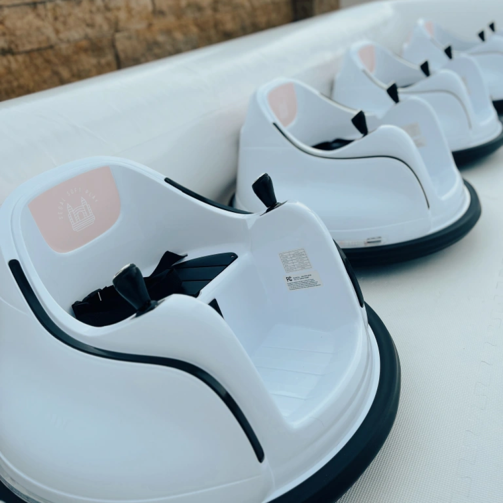 Includes the Following: 13ft x 13ft inflatable bumper car arena, 4 bumper cars, 4 controllers, shoe bench and safety sign