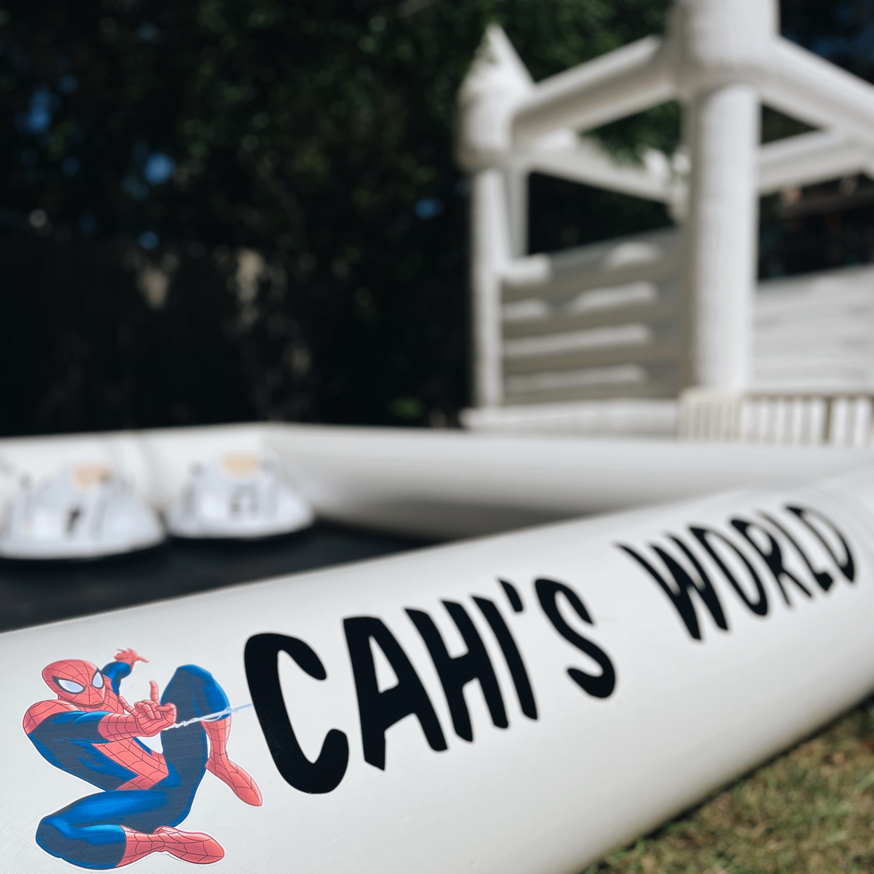 Includes the Following: 8ft x 8ft white bounce house, blower, entrance mat, shoe bench and safety sign