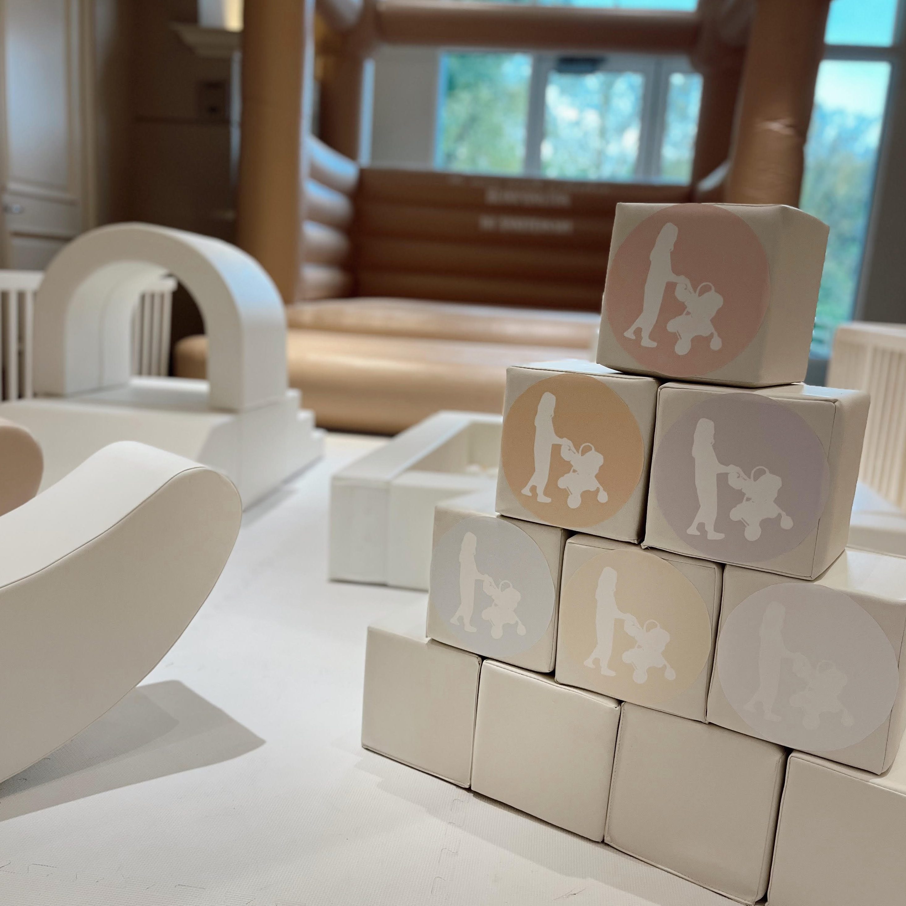 Includes the Following: 12 different XL sized shapes and one ball pit. A variety of slides and stairs to run up and jump down, tunnels to crawl through, a banana for rocking fun and a ball pit to ensure a safe environment for the kids to play. foam tile flooring, shoe bench and safety sign